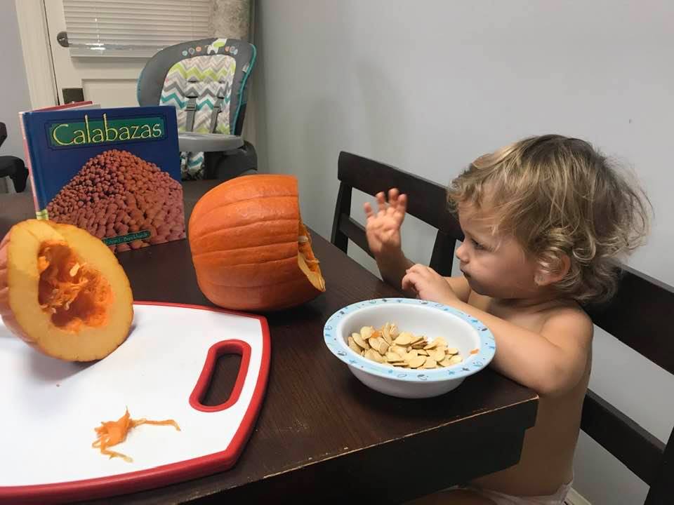 If you opened either of the play plans you see I put various ideas and plans for just a three day period in the week. I am EXTREMELY laid back and flexible, I do not force anything on Emma. I motivate, excite, and introduce ideas though and to be honest most of the time Emma takes my hand and tries to bring me upstairs to play school while I am still having my morning cup of coffee and have not drank my crankies away yet! If you are at this place with your child where they don’t like structured play, that is totally normal! Emma wasn’t always thrilled, but I would implement at least one or two planned play developmental areas on the daily and work up to targeting four developmental areas in the morning and afternoon. Every child is different and every family situation is different. I accumulated various resources from awesome and creative bloggers that you can easily access if you ever want incorporate pumpkins/calabazas in your toddler’s day.