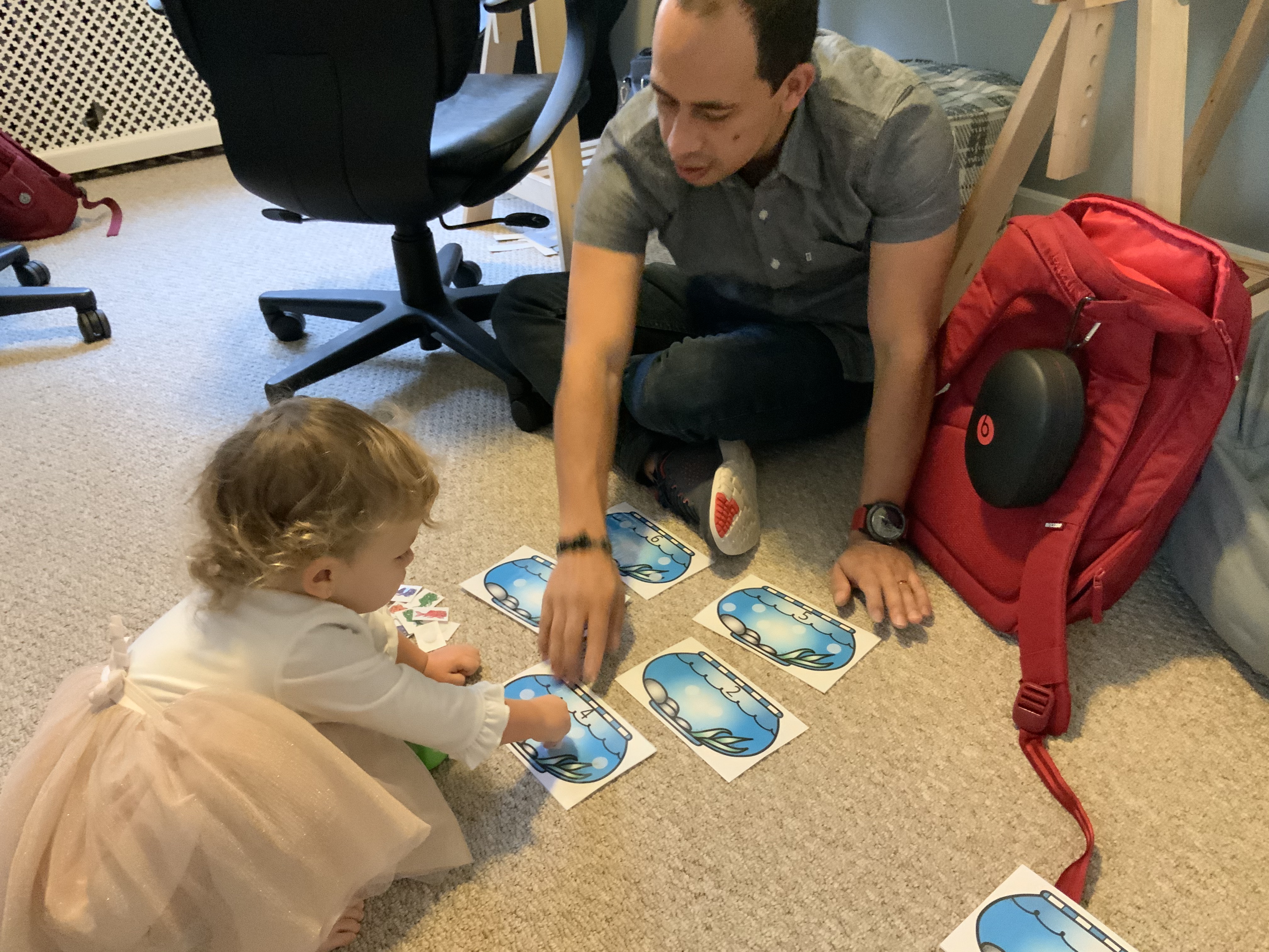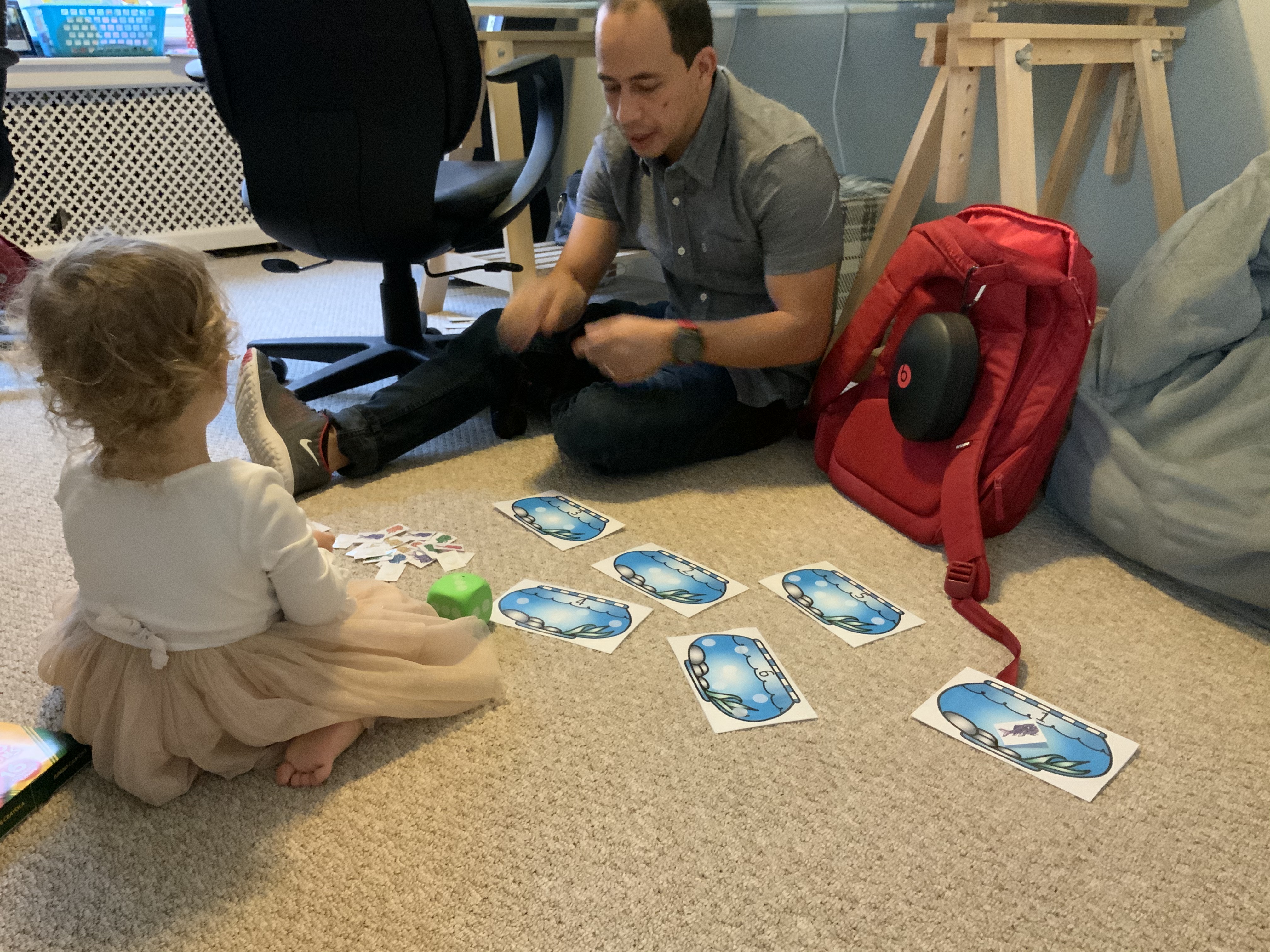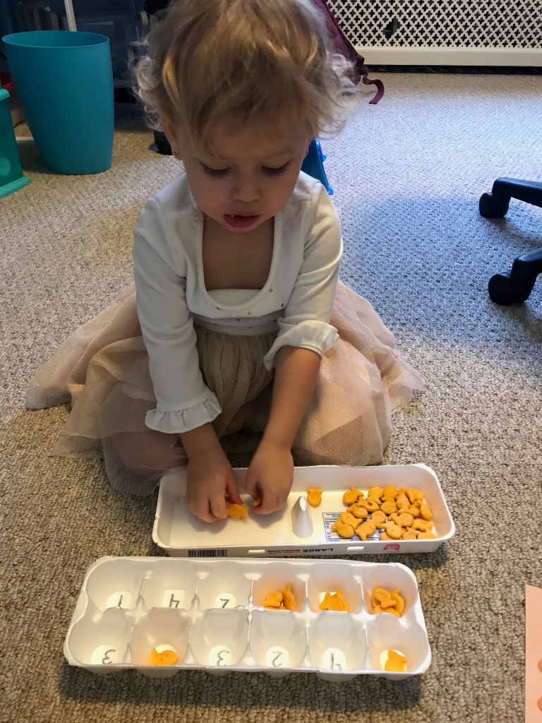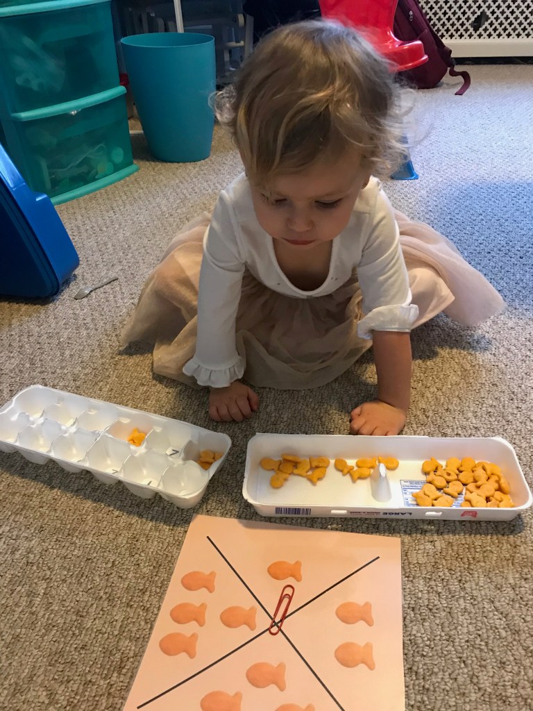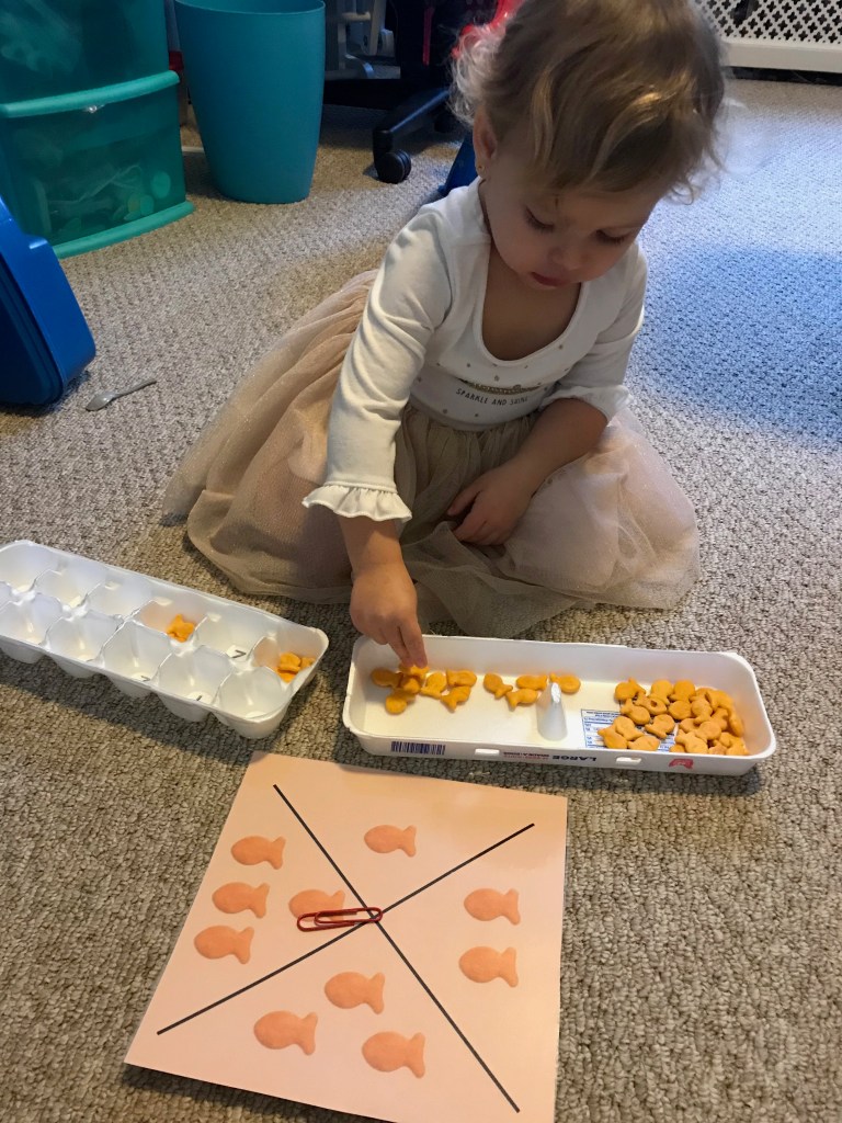 - We learned first how to work the spinner by her having to eat the number of goldfish that she spun. Then we added the next step by putting the correct number of fish in the egg holes. Then we added the steps together.