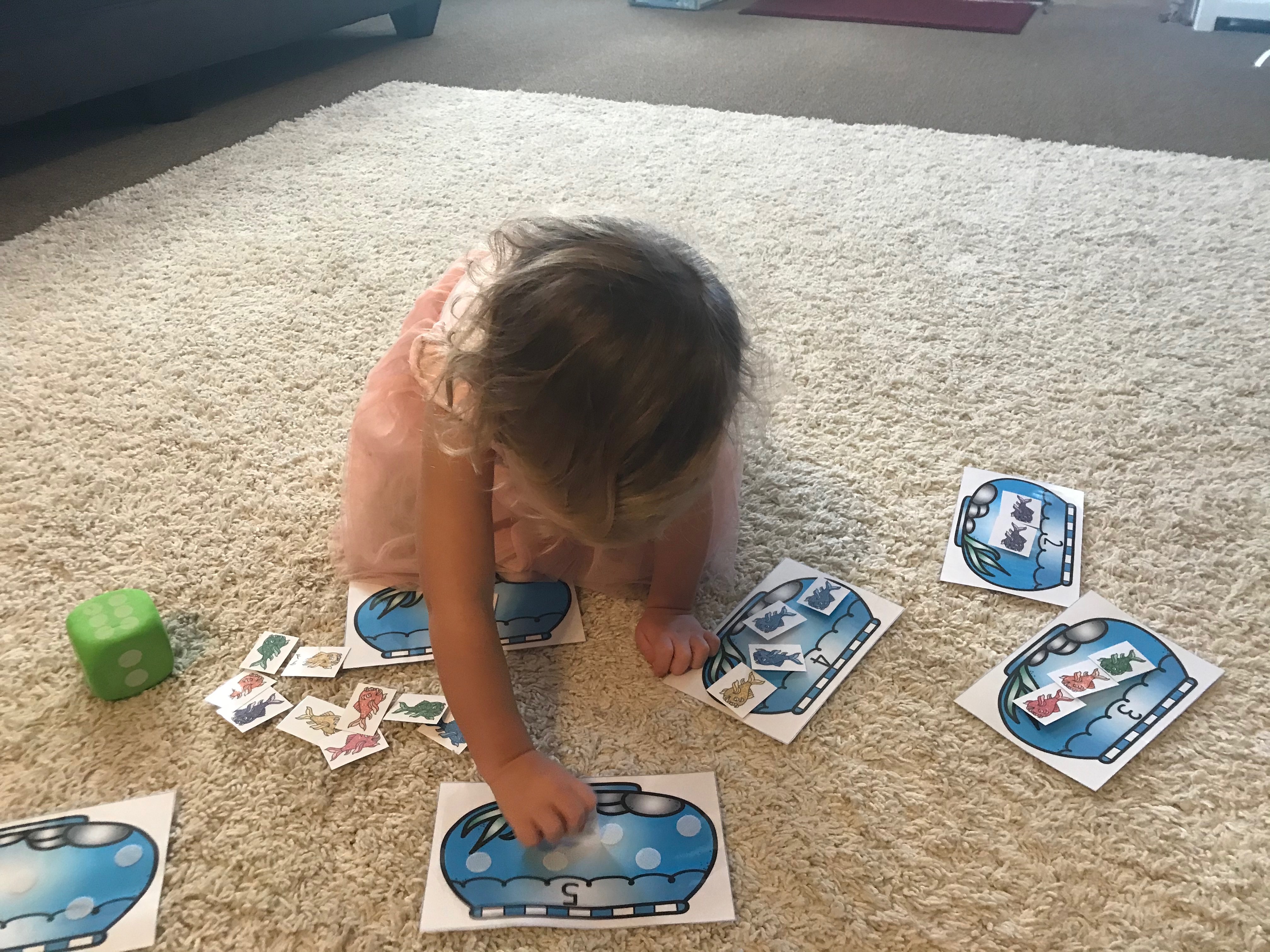 - In this activity Emma had to roll the dot dice, count the dots, and put that number of fish on the correct numbered fish bowl.