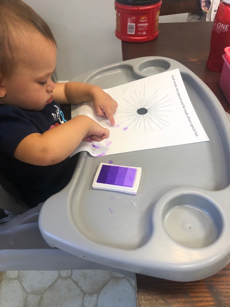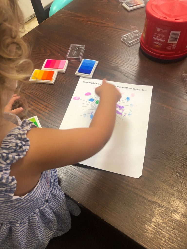 Bible: Our Bible focus was that the Lord loves everyone equally and that God made us all unique and special. They learned about their fingerprints how everyone is different on the outside, but that we all have the same inside (heart and soul). Jesus loves the Little Children of the World song was our theme song.