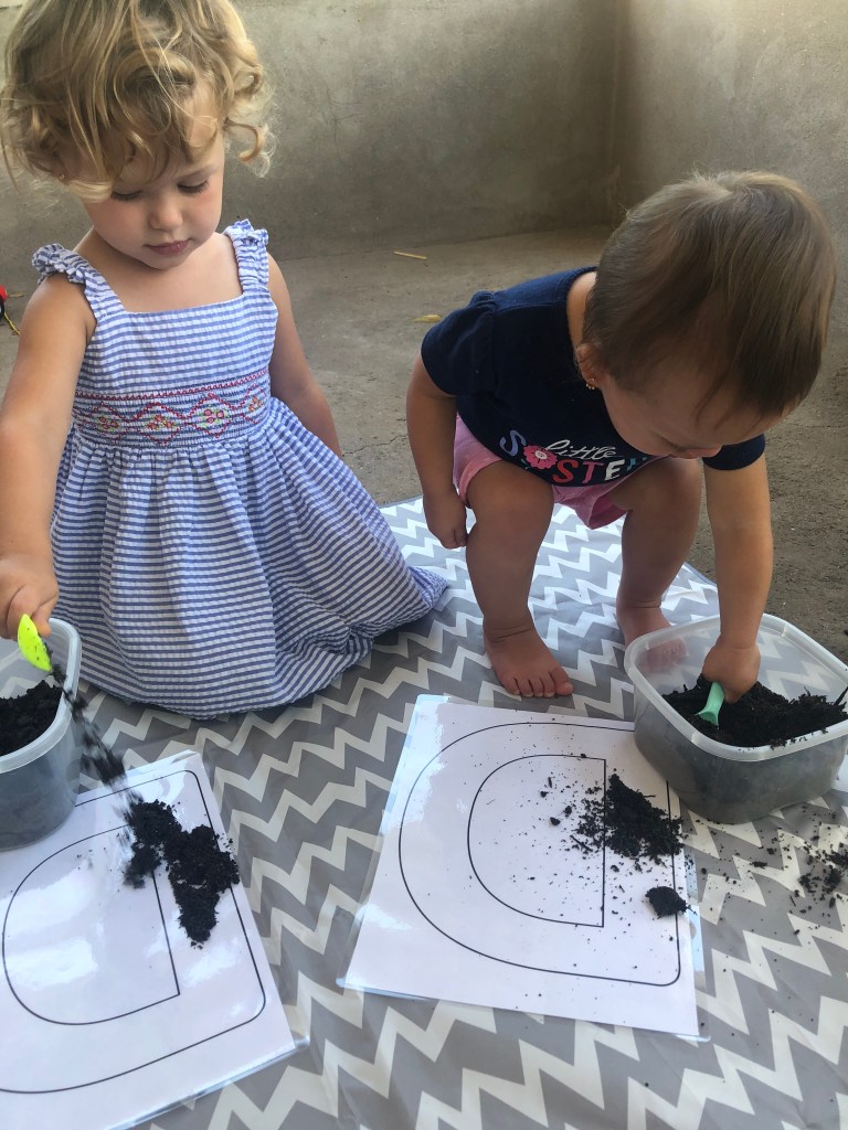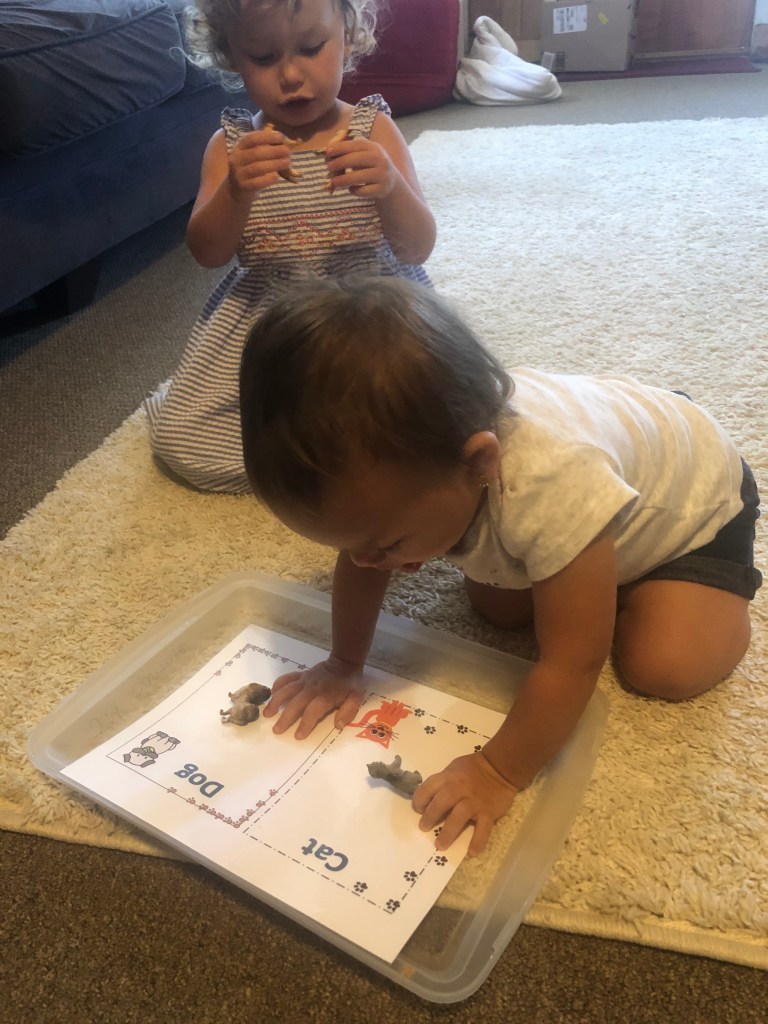 Sensory: Snap cube building and sorting in beans, dog find in water beads, dirt digging for dogs plus letter D fill, and doggy baths.