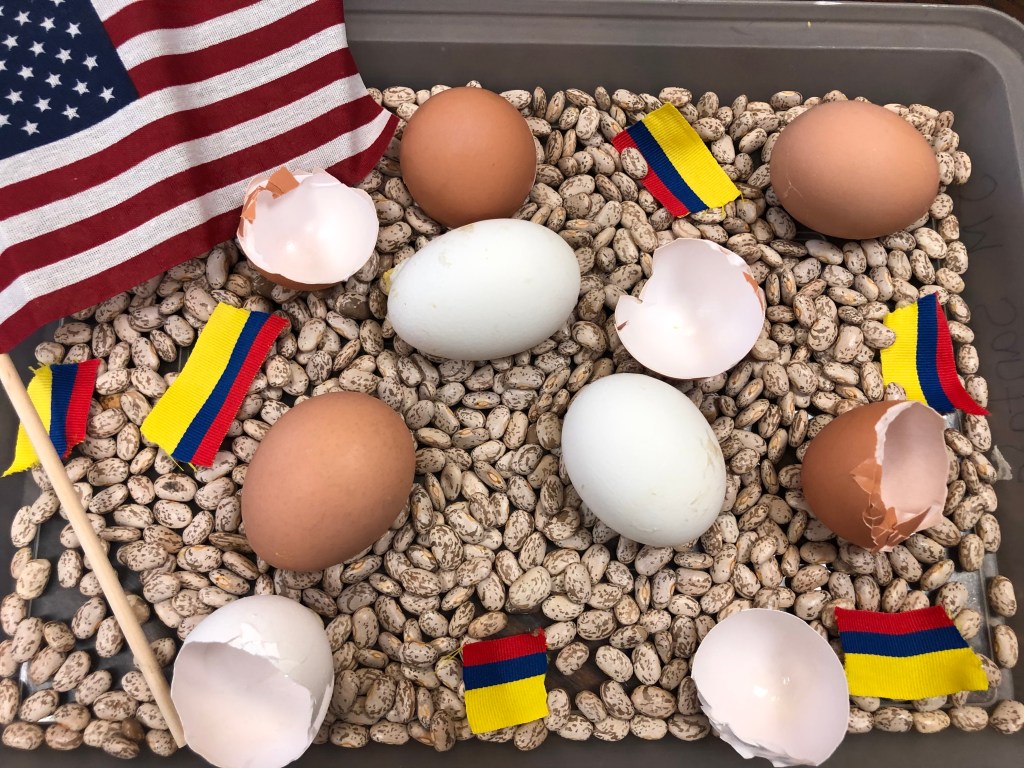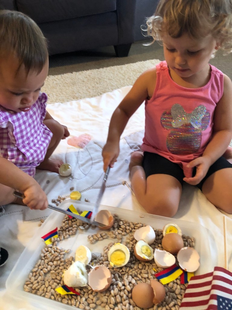 We are entering week #3 of Mama’s Bilingual Play-School, I have been “playing school” with my girls since I can remember. As always, my definition of play-school is simply, intentional play. This month is about patriotism of both USA and Colombia since we are a bicultural family. Here are some snapshots of our intentional play this past week. This was our play plan calendar from last week.