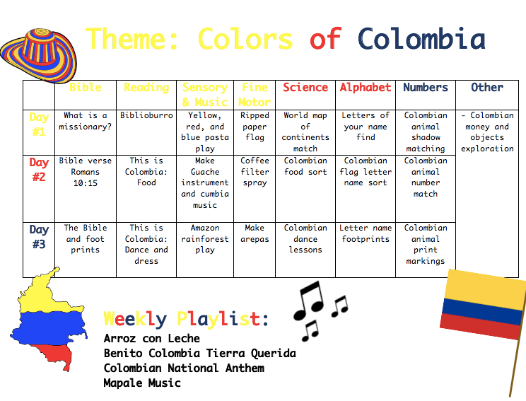 Thanks for joining our journey of PLAY-school. I make all our own activities and materials, if any of these things interest you please message me either on this blog or by e-mail. My e-mail is msantafe@avmi.org and I would love to connect you to our journey. Many blessings! Happy parenting! Stay tuned for our fun week ahead of Colors of Colombia as we begin our two weeks of patriotism of the Colombian side of our family heritage.